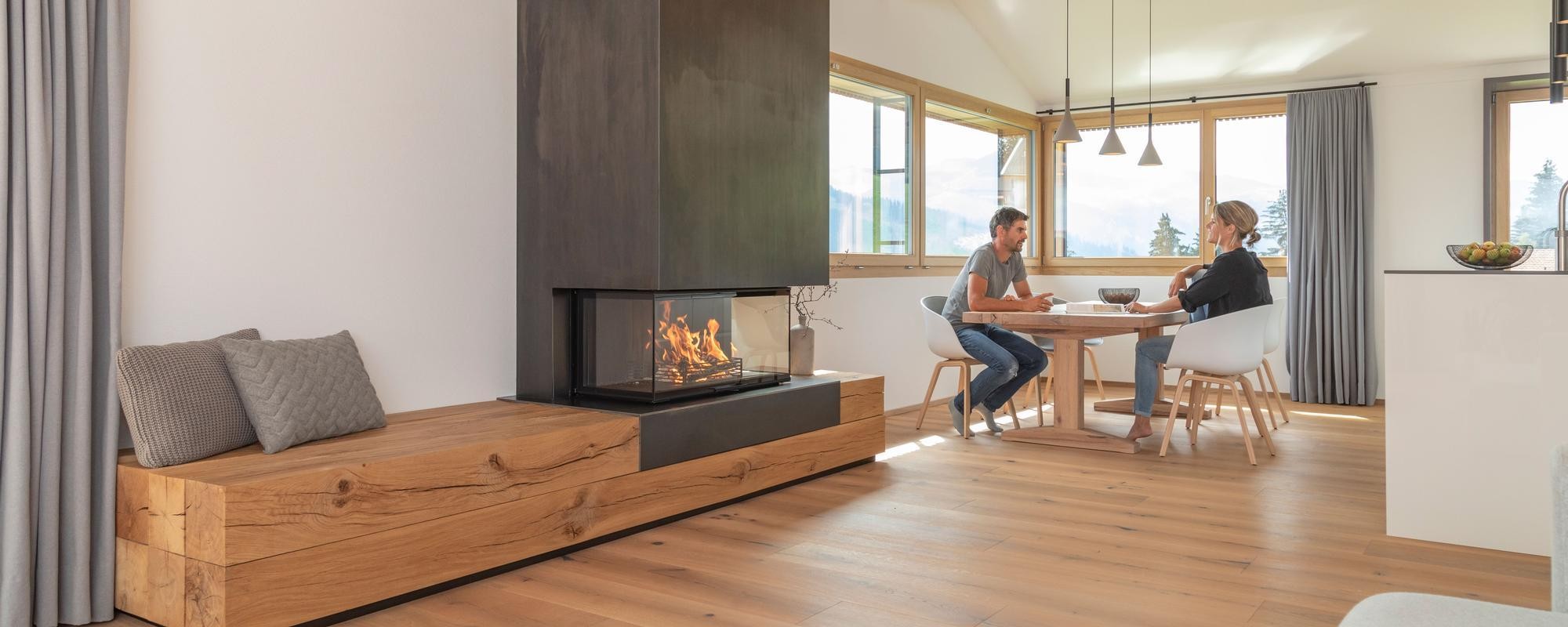 Wir von Rüegg Schweiz bauen für Sie mit Leidenschaft seit mehr als 60 Jahren hochwertige Kamine. Unsere Neuigkeiten setzen seit Jahrzehnten Massstäbe. Diese Qualitäten vereinen sich auch im neuen 3-seitigen Rüegg RIII, der dank Rundumperspektive Lagerfeuerromantik in den eigenen vier Wänden verbreitet und technisch mit raffinierten Details überrascht.